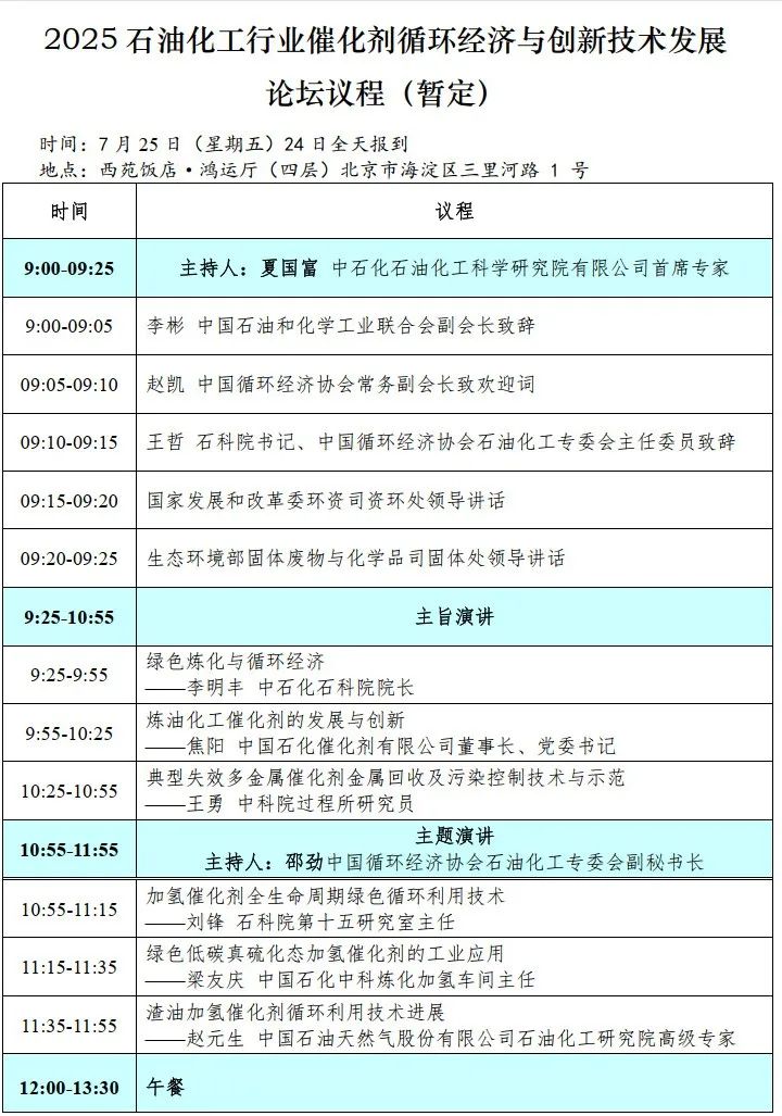 為了方便技術交流,促進行業互鑒互促,本次交流會后中文核心期刊《石油煉制與化工》(CN11-3399/TQ)編輯部將出版《2025石油化工行業催化劑循環經濟與創新技術發展》論文集,歡迎各單位有關專家和技術人員根據論壇主題積極投稿,要求見附件3投稿要求,截稿日期2025年8月31日。