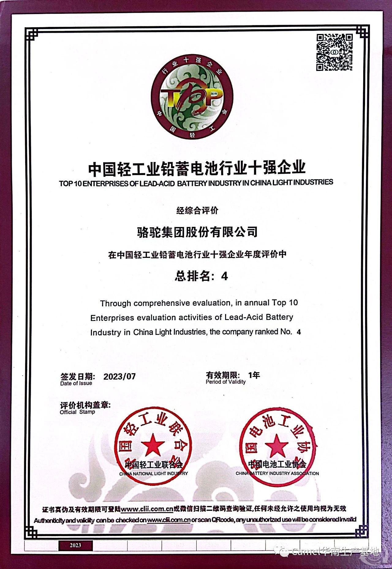 中國循環經濟協會理事單位駱駝集團股份有限公司榮膺“2023中國輕工業鉛蓄電池行業十強企業”